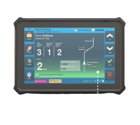 Flownex-Drive is a driver/operator console that connects the driver with the Bus CAD/AVL system and onboard devices, providing real-time route, schedule, stop progression, and service alerts through a safe, glanceable interface.